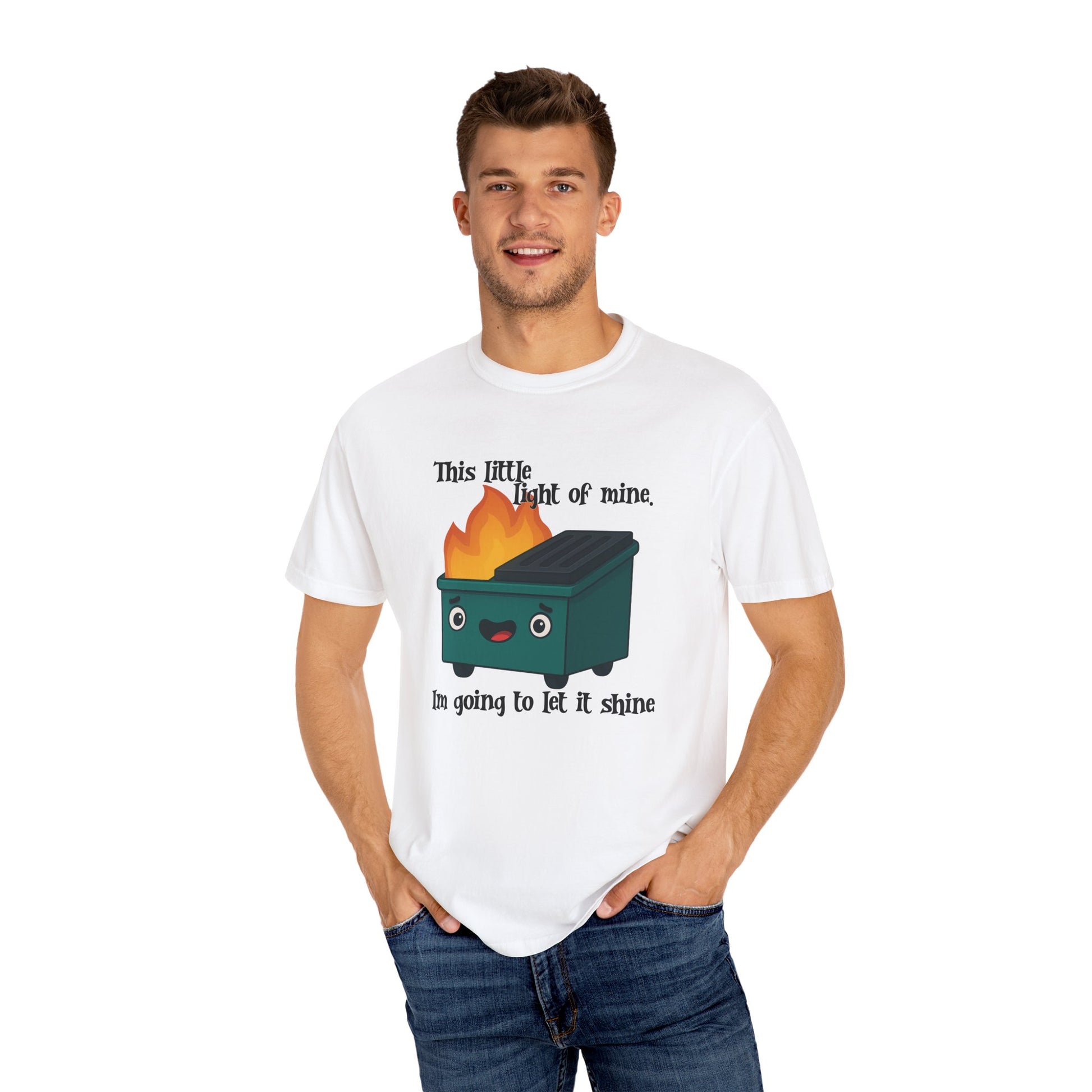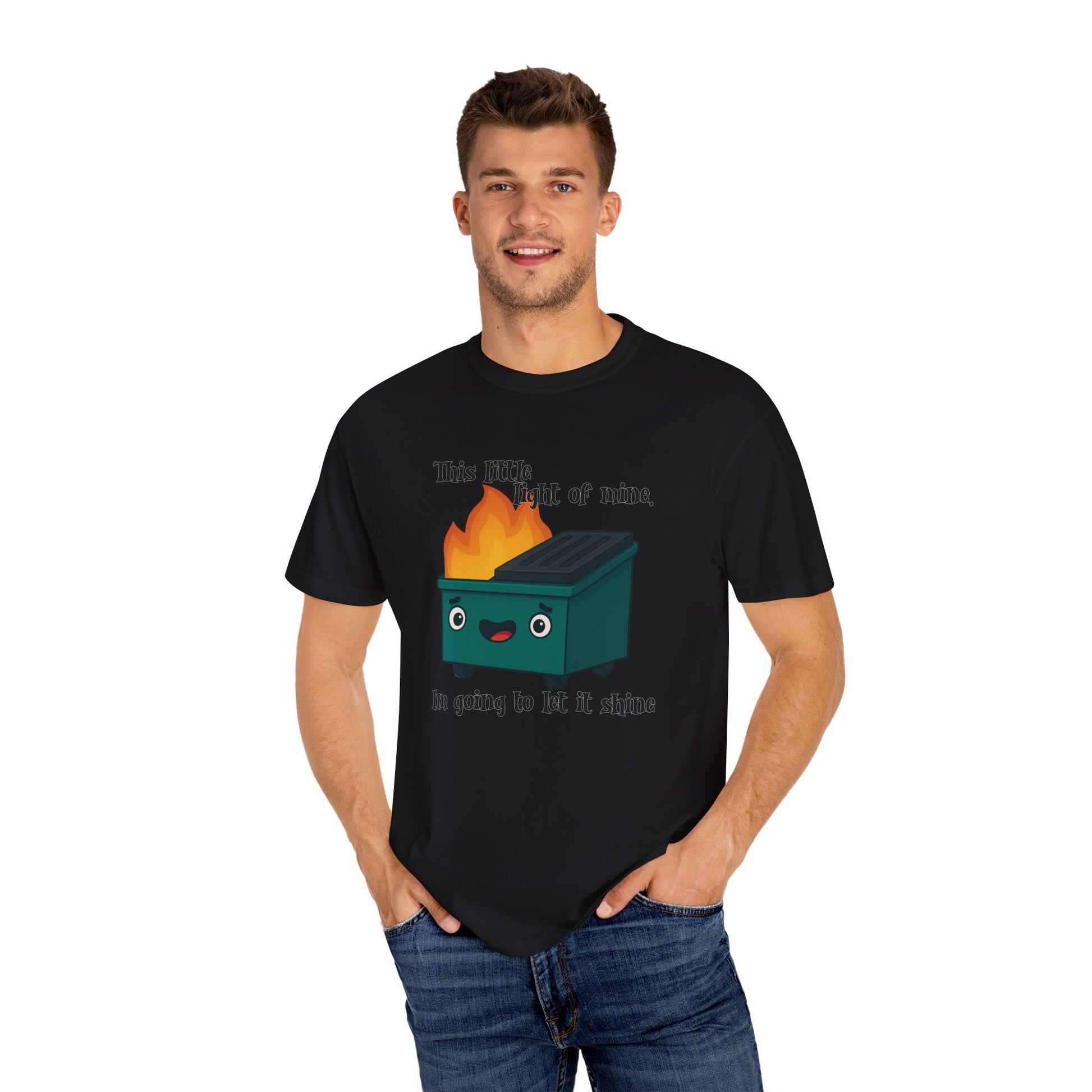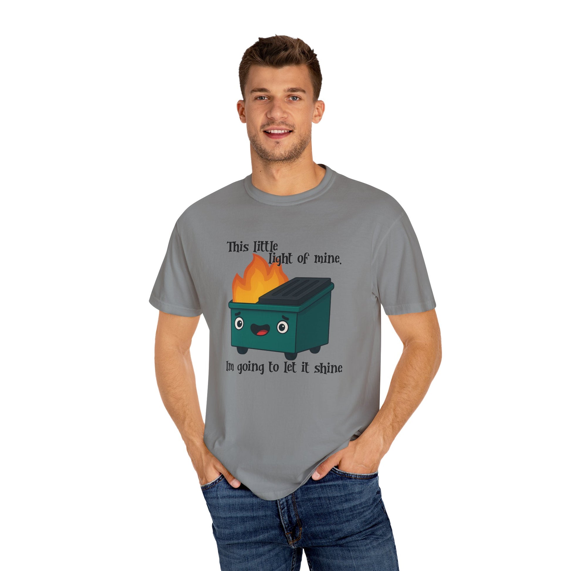 Funny dumpster fire meme design on a relaxed fit, garment-dyed T-shirt. Perfect for those looking to let their light shine through humor. Ideal for anyone with a sarcastic sense of humor and relevant for birthdays, holidays, and casual everyday wear.