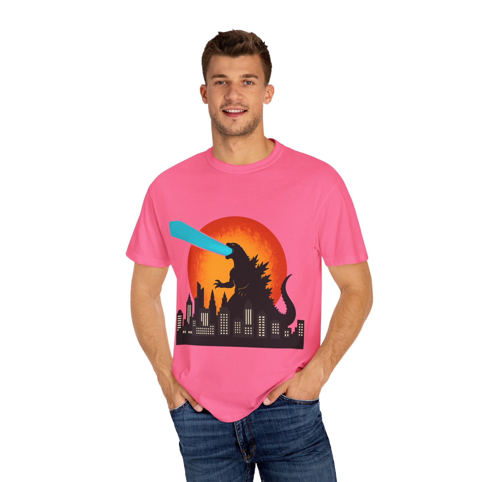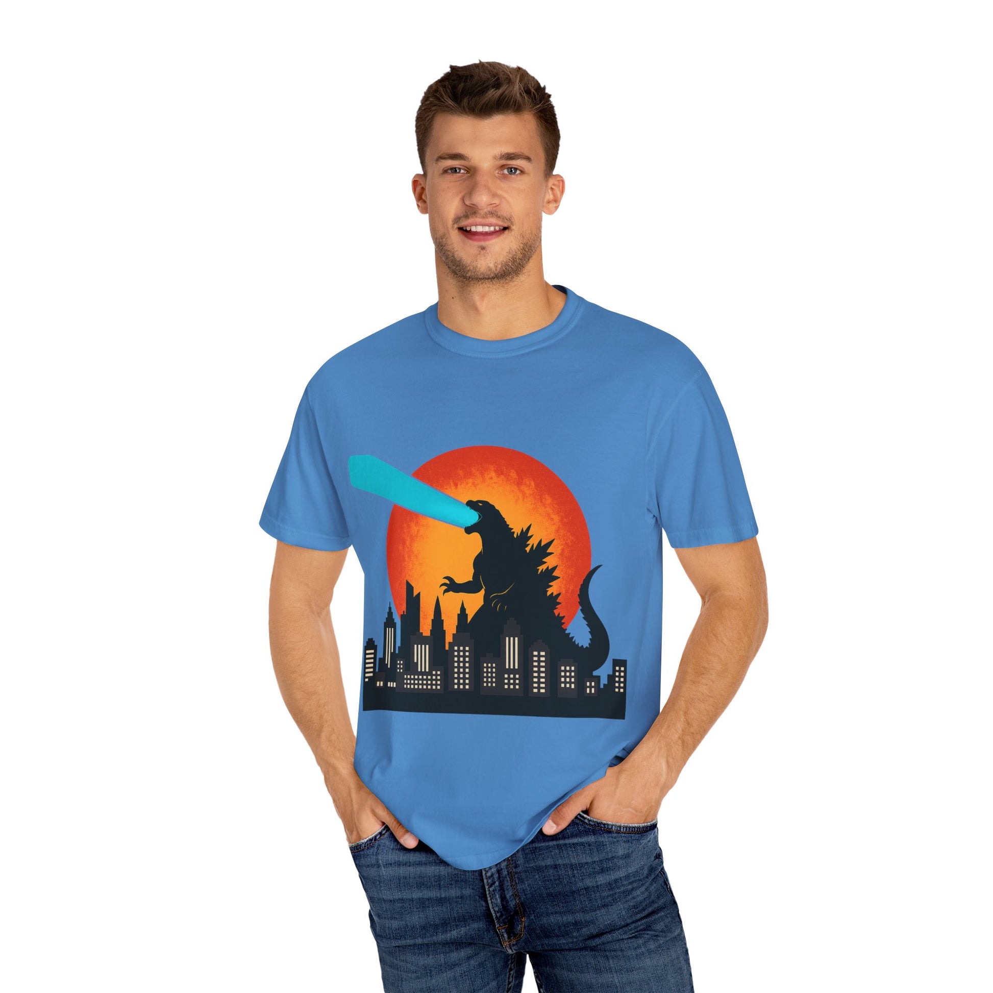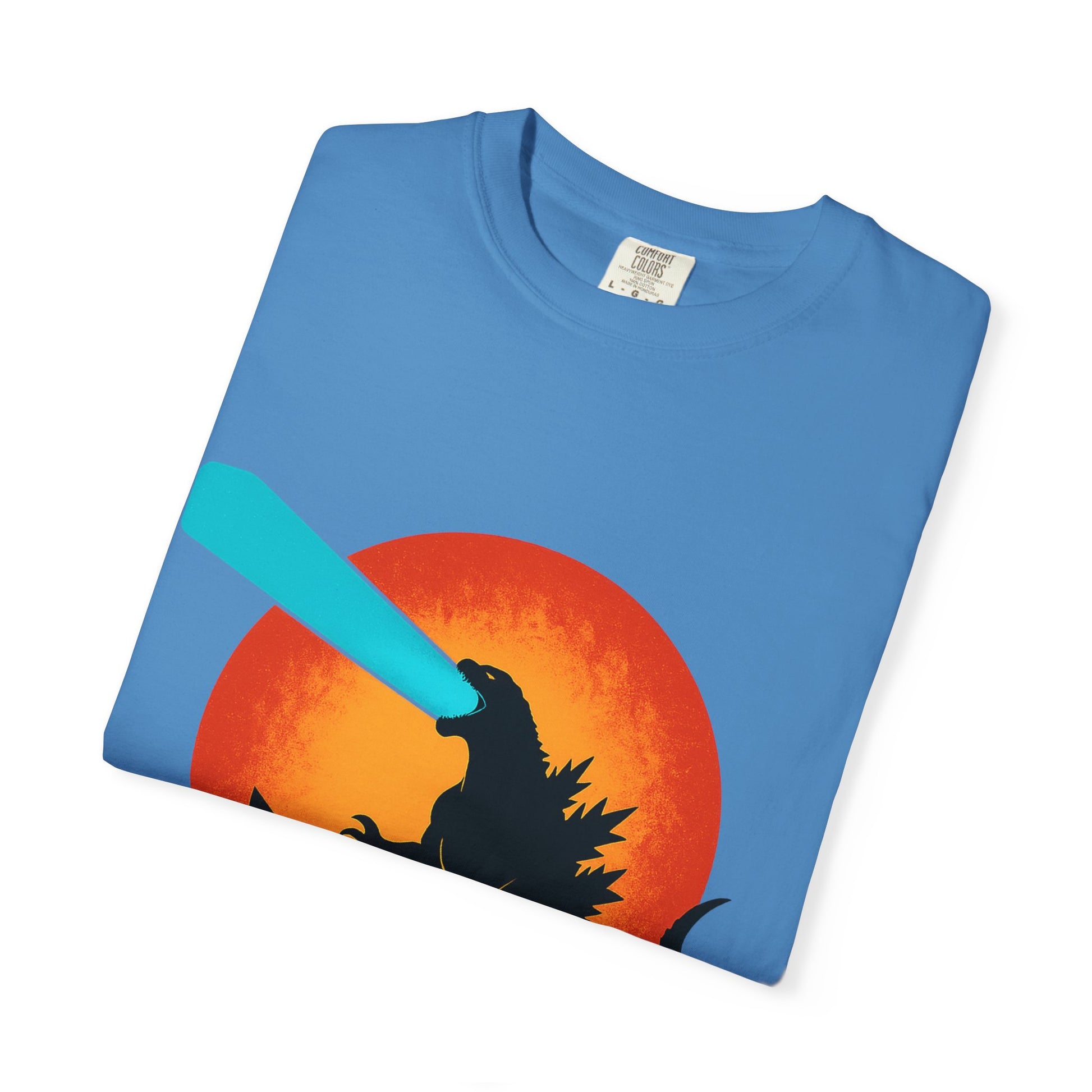 This cool Godzilla-themed T-shirt features an Atomic Breath design against a scenic sunset backdrop. Perfect for fans of monster movies and those who appreciate unique, eye-catching apparel. Ideal for casual wear or as a statement piece for special events or themed parties.