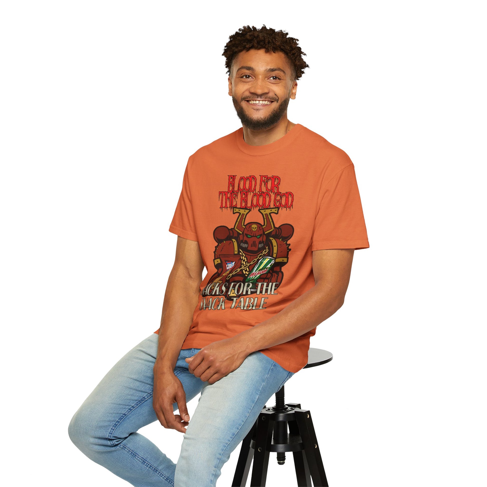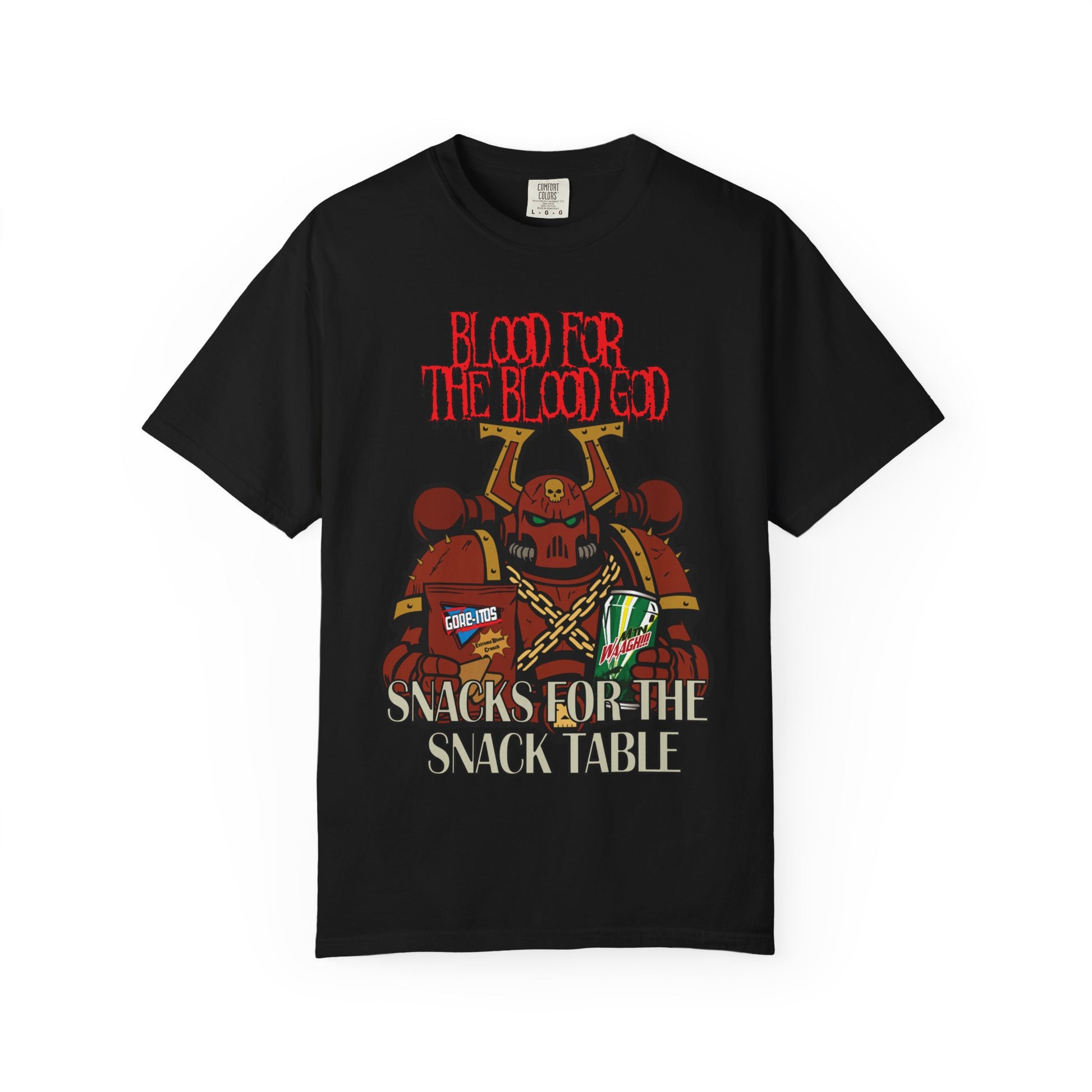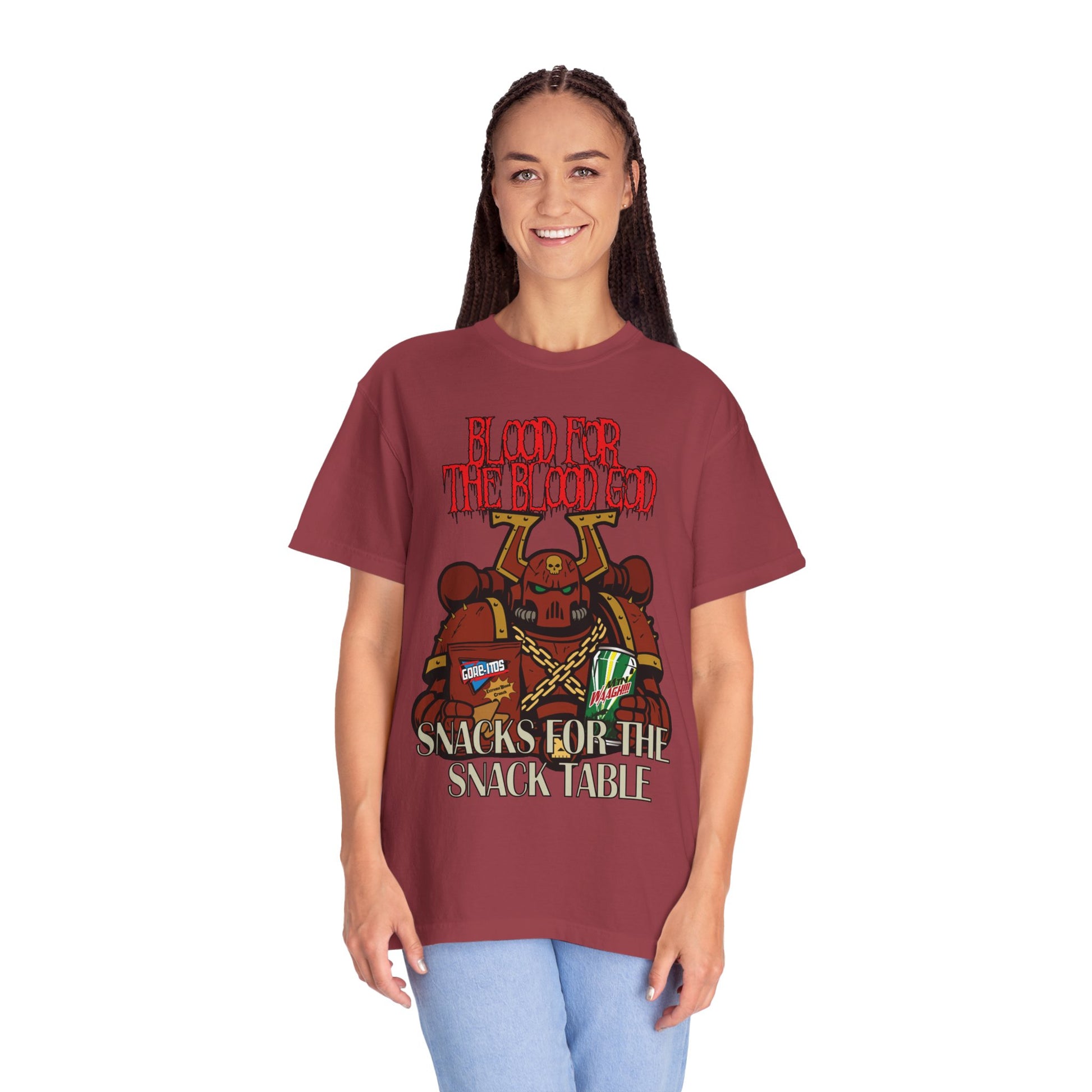 This Warhammer 40k inspired t-shirt featuring Khorne Berzerkers is perfect for the Chaos fans looking for a funny and meme-worthy design. With 'Blood for the Blood God, Snack for the Snack Table' print, this garment-dyed tee gives off a chaotic vibe. Great for gamers, meme enthusiasts, and those celebrating Halloween or gaming events.